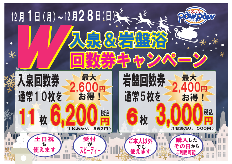 - 2025年12月05日 【スパぱうぱう】入泉&岩盤浴 w回数券キャンペーン 実施中! 2026年12月28日まで